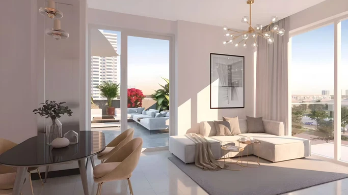 The neutral colour scheme of the minimalist interior design, mostly in shades of beige and light brown, is enriched with the use of natural wood materials and different decorative elements inspired by the natural world. Each apartment has large windows that provide plenty of natural light and offer stunning views of Dubai Studio City.